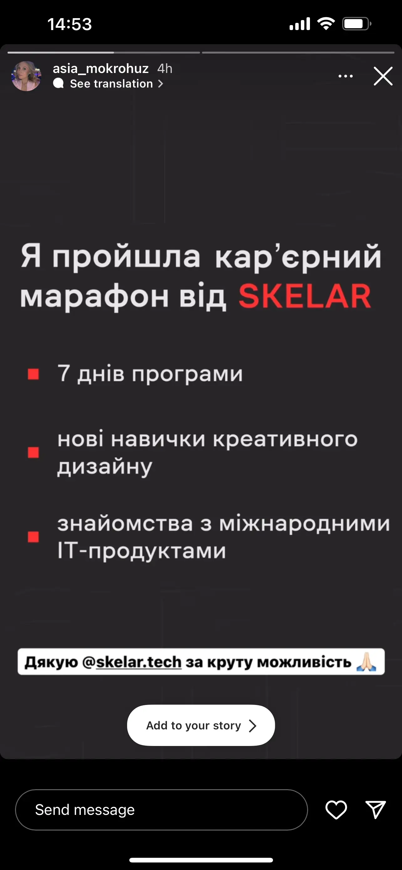 За умови успішно проходження стажування ми будемо раді запропонувати тобі оплачуване стажування на роботу в SKELAR.